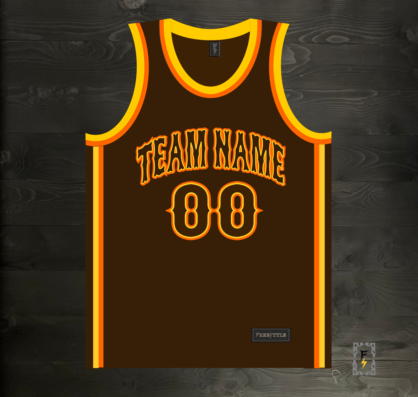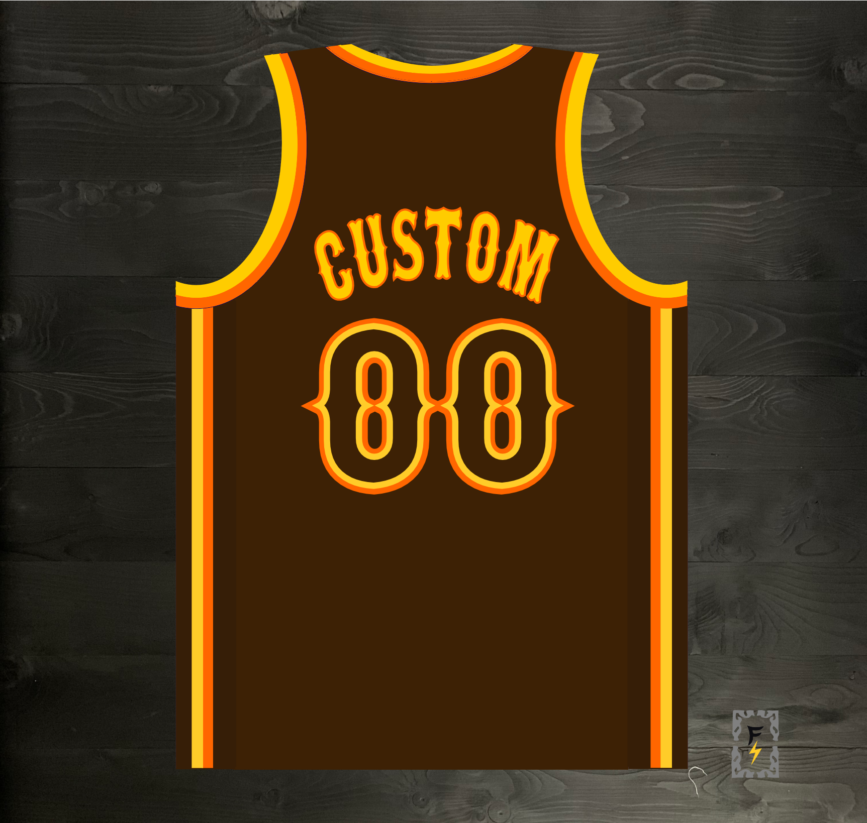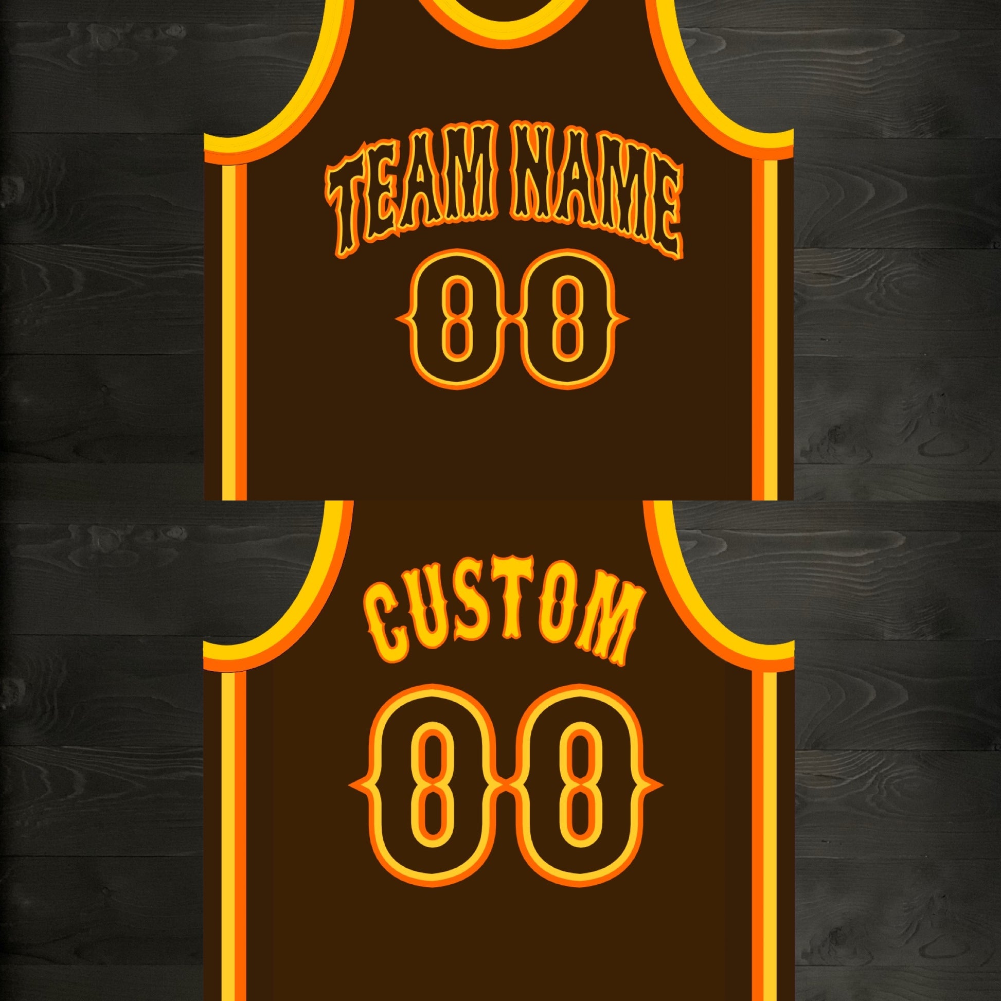 A-103m - CUSTOM Team Name and # Brown Orange Yellow on Brown - MADE TO ORDER